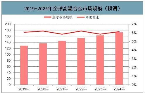 2012 -2018年全球高溫合金市場(chǎng)規(guī)模合計(jì)758億美元,年均市場(chǎng)規(guī)模約為108億美元;2018 年全球高溫合金市場(chǎng)規(guī)模為 121.63 億美元,同比增長(zhǎng) 4.8%,預(yù)計(jì) 2024 年全球高溫合金市場(chǎng)規(guī)模將達(dá)到173億美元。航空航天領(lǐng)域是高溫合金的主要需求來(lái)源,當(dāng)前我國(guó)國(guó)防建設(shè)正處于關(guān)鍵時(shí)期,高溫合金市場(chǎng)需求將遠(yuǎn)超全球市場(chǎng)整體增速。